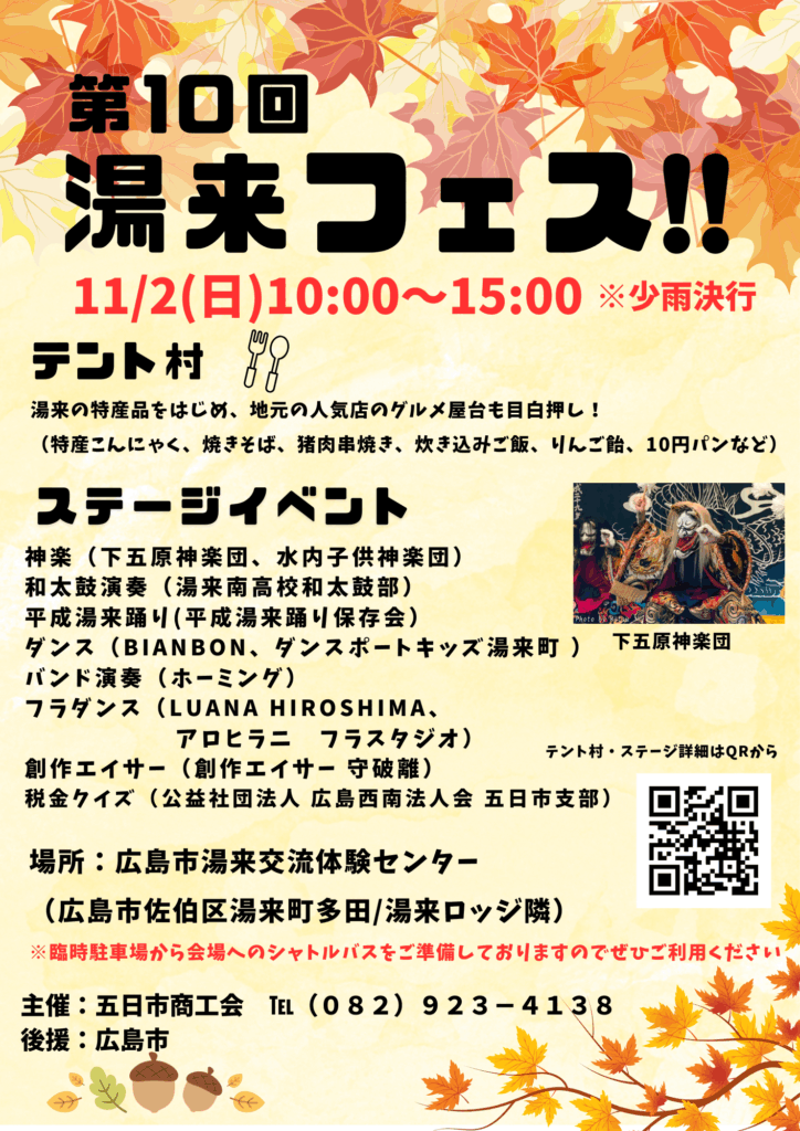 秋の恒例イベント「湯来フェス‼」を今年も開催します!湯来の特産品や地元人気店のグルメ屋台が勢ぞろいする「テント村」、迫力満点の神楽や太鼓演奏、ダンス・バンド演奏などが楽しめる「ステージイベント」など、盛りだくさんの内容です。地元の味覚を味わいながら、音楽やパフォーマンスで秋の一日を満喫しませんか?ご家族やご友人お誘いあわせのうえ、ぜひお越しください!