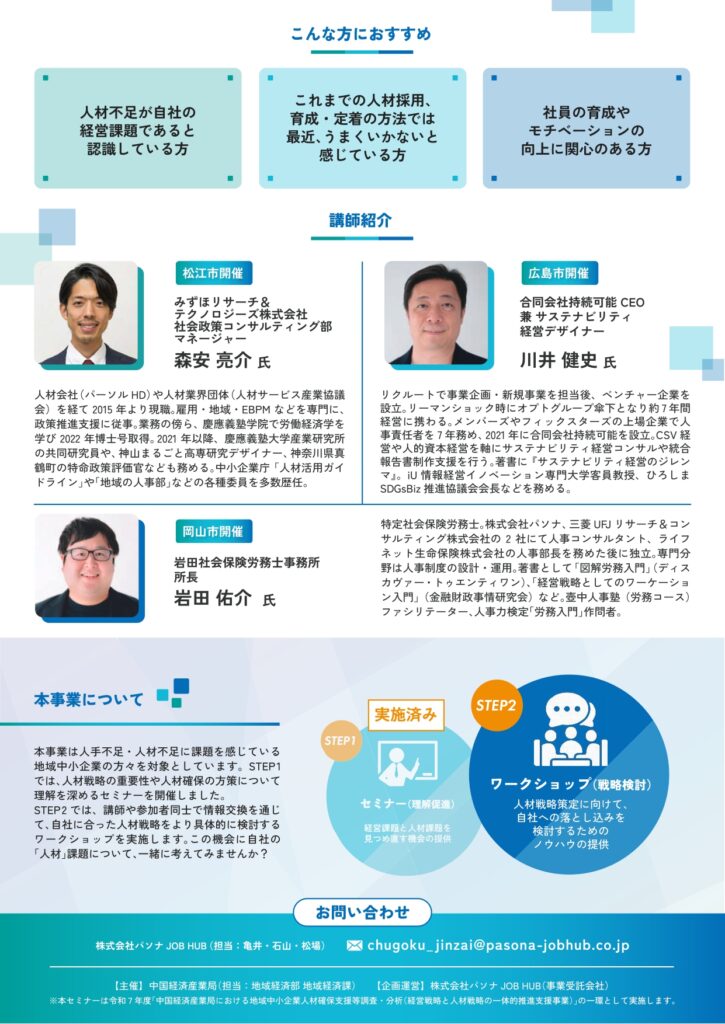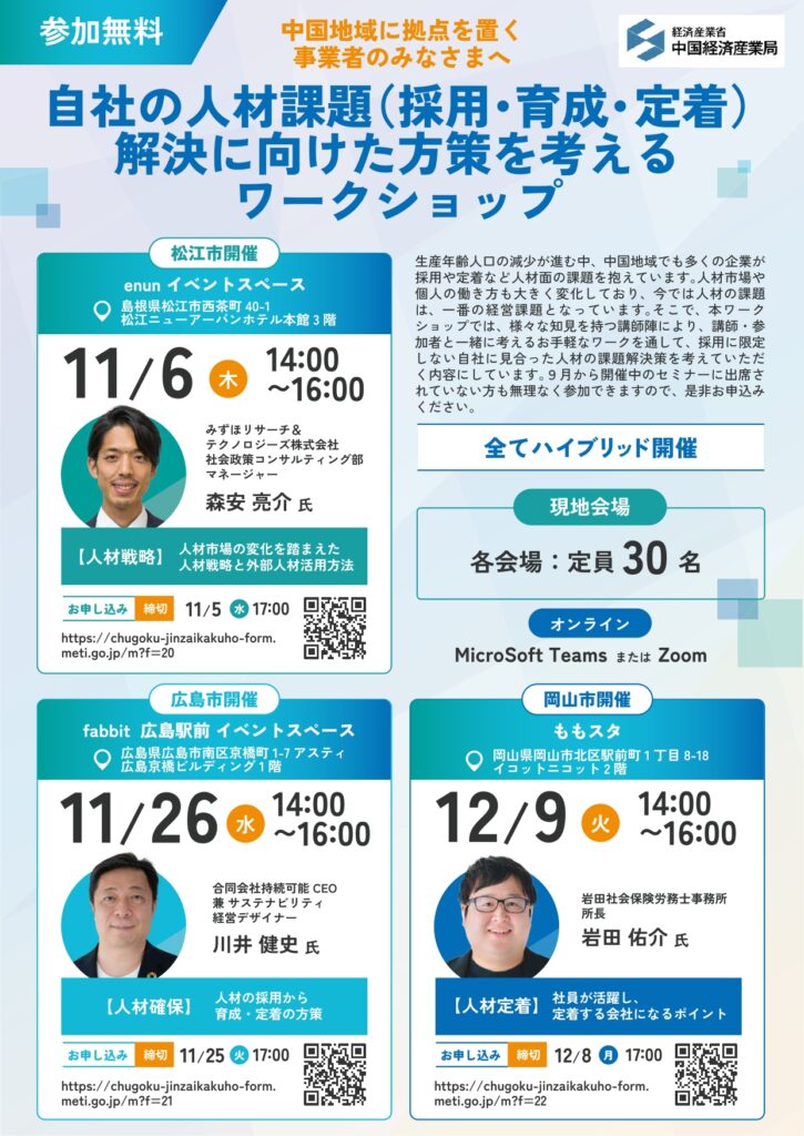 中国経済産業局では、事業者及び金融機関・自治体を含む支援機関の方々に向けてワークショップを開催します。本ワークショップでは様々な知見を持つ講師陣により、お手軽なワークを通して採用に限定しない自社に見合った人材面の課題解決策を一緒に考えていきます。